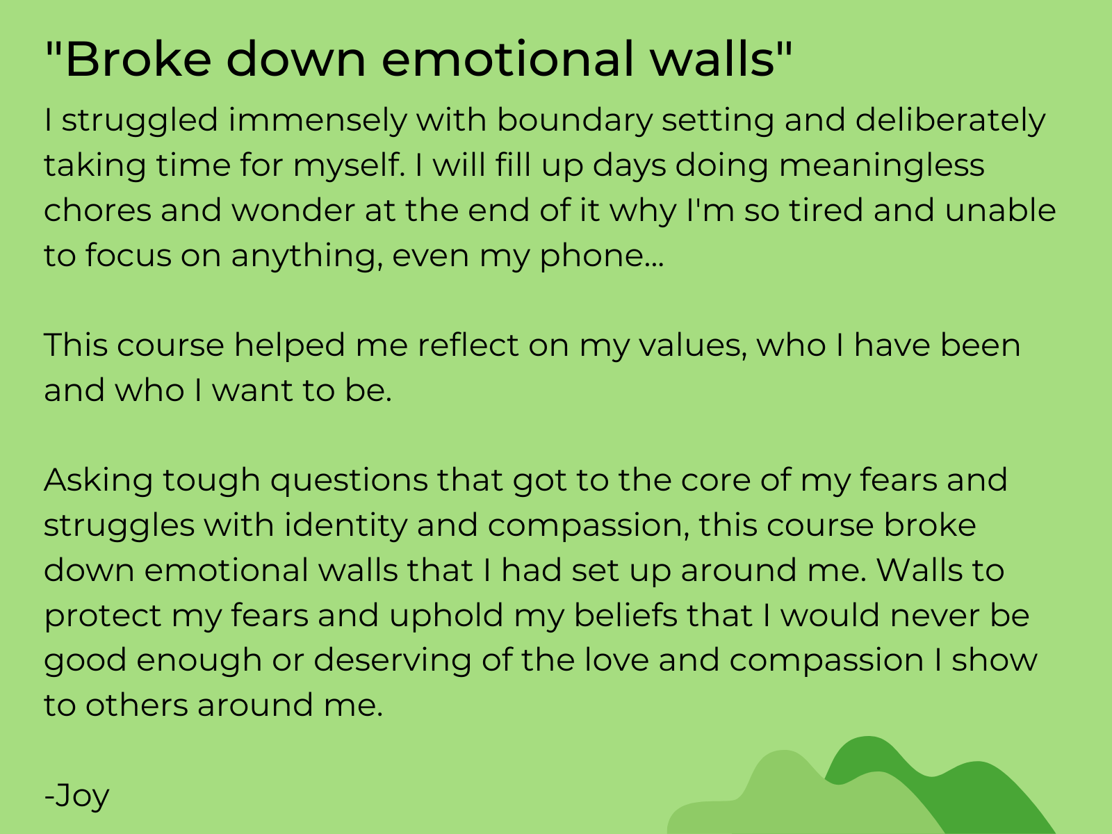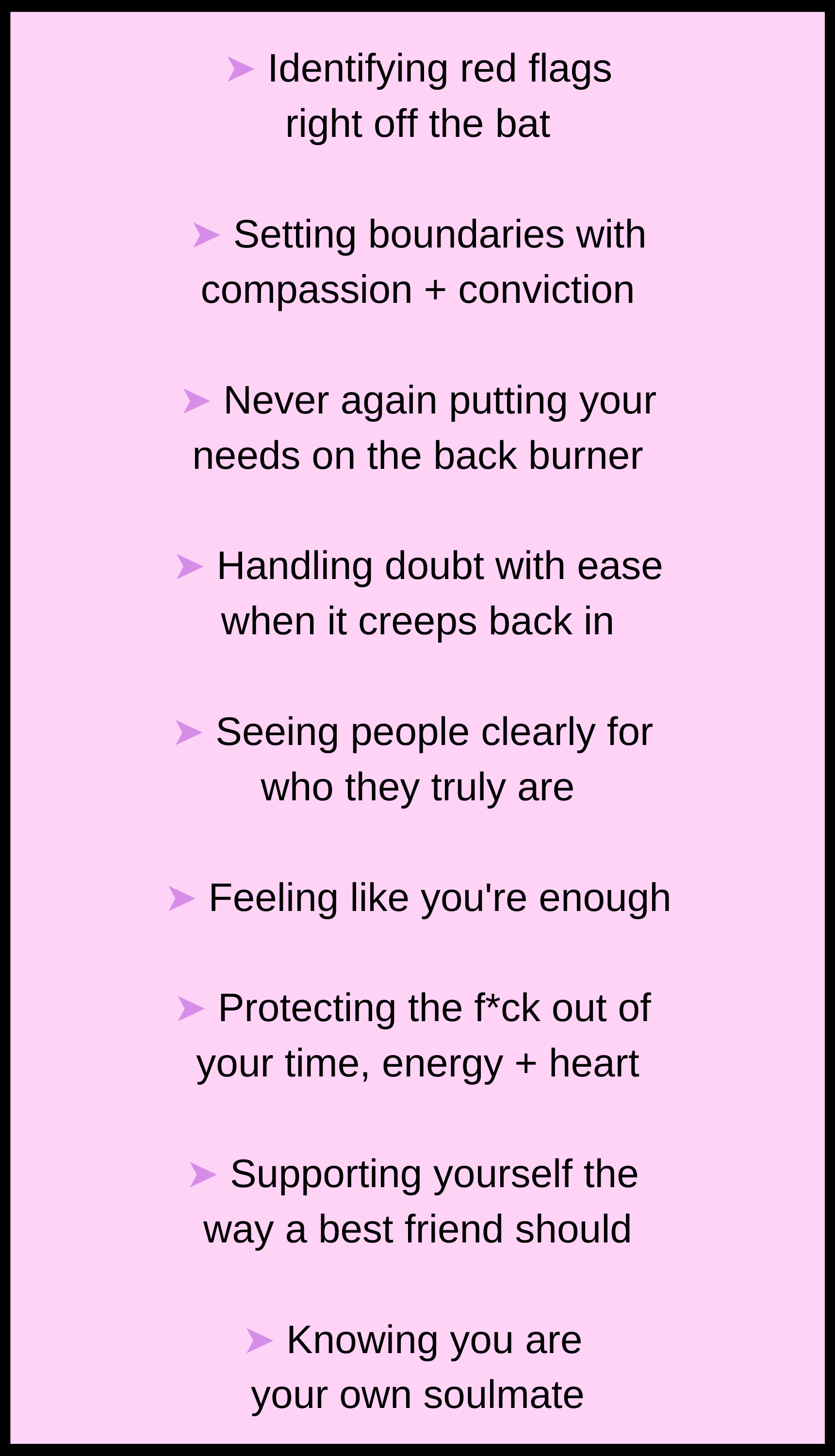 TLDR: Become Your Own Soulmate is the ultimate self-paced, online course with to-the-point teachings. Stop pouring your heart into the wrong people, set guilt-free boundaries and have indestructible faith in yourself.