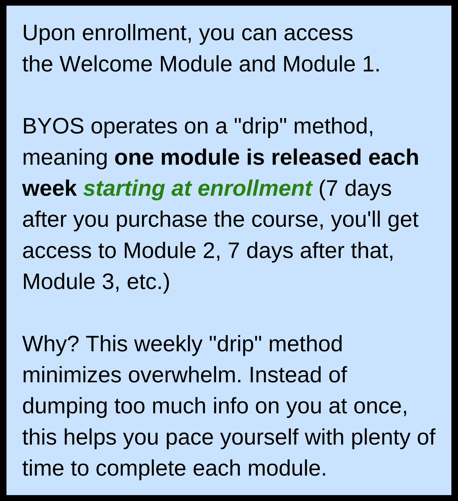 Yes, that’s why I made BYOS self-paced. Meaning, you can take it on your own time. No rush, pressure or falling behind.